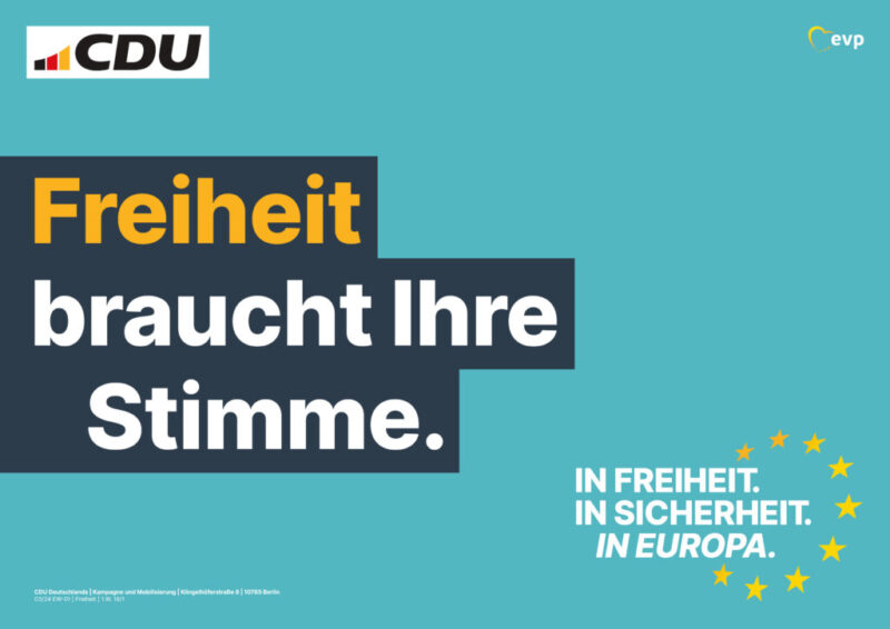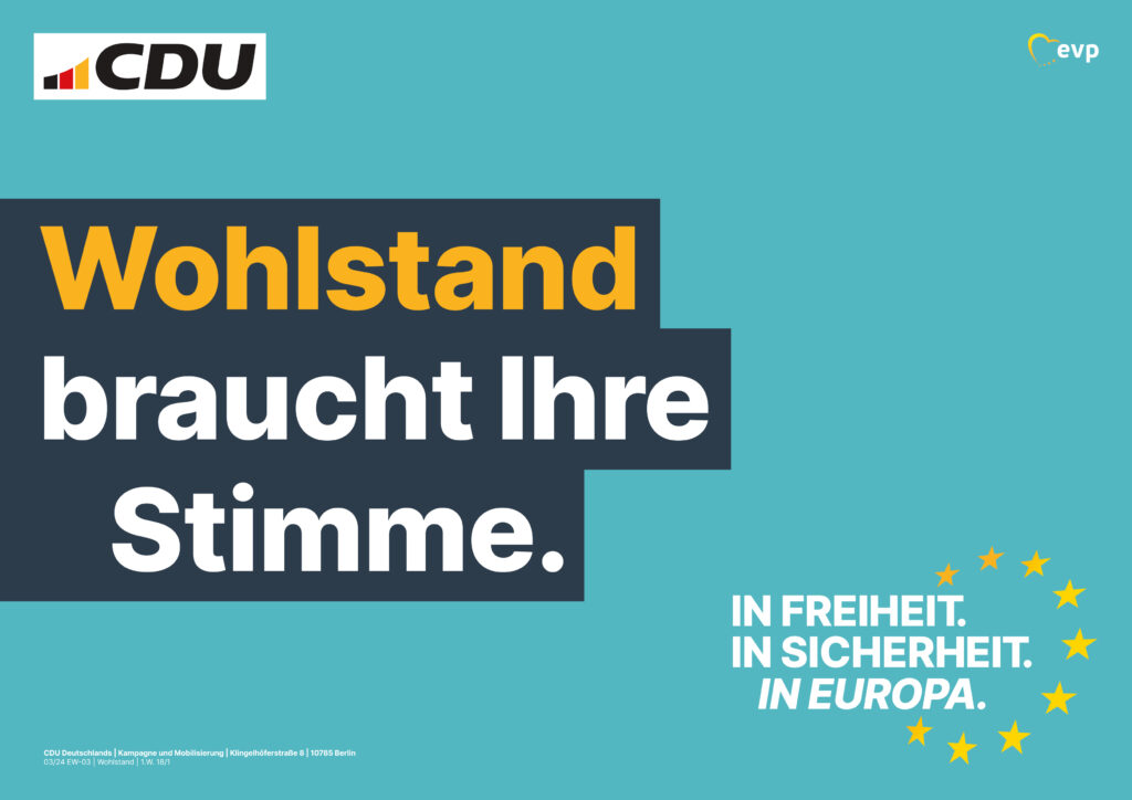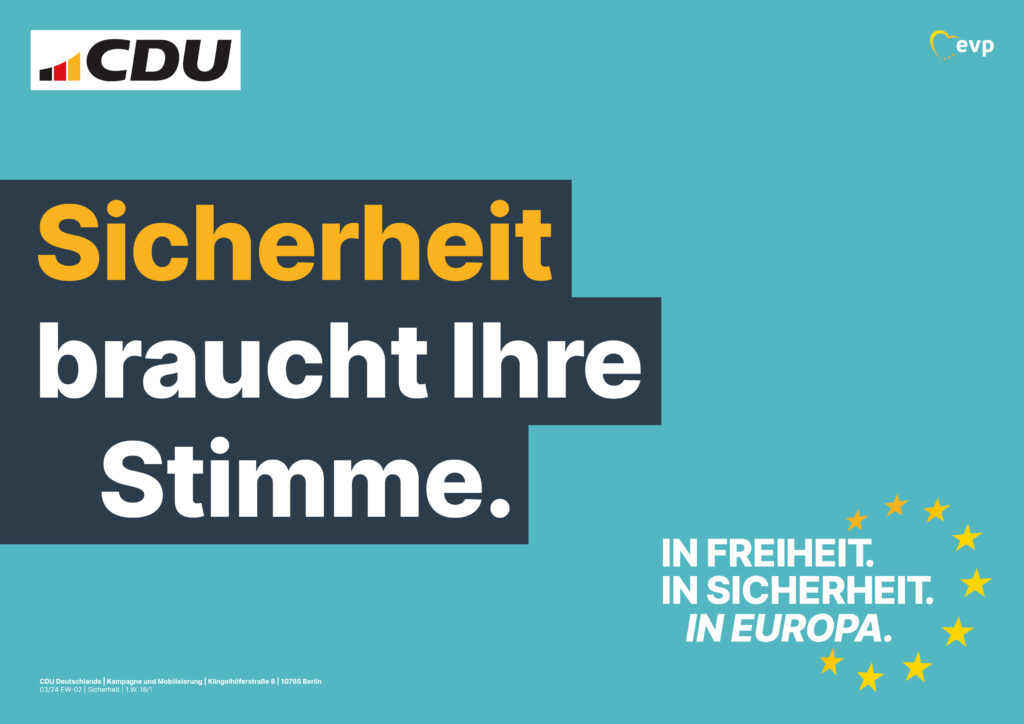 Wie die AFD kann es auch die CDU bei der Europawahl nicht lassen, die Deutschlandflagge zu hissen. Wenngleich auch die Sterne der Europafahne unten rechts zu finden sind. Ansonsten wirkt das Plakat klinisch und flach. Ohne Struktur, ohne Motive, ohne Foto oder Abbildung. Der jeweilige Kernbegriff ist visuell angenehm, dabei keineswegs aufdringlich oder markant, orange eingefärbt. Mit diesen Plakaten lassen sich auch andere seriöse und langweilige Produkte verkaufen wie sichere Finanzanlagen, Versicherungsapps oder Drogerieartikel.