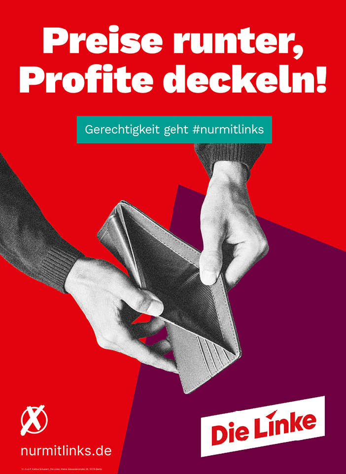 Immerhin die Plakate sind endlich mal etwas peppiger. Klare Aussagen, deutliche Bildsprache und keine nervige Deutschlandfahne mehr. Der Person mit der leeren Brieftasche helfen allerdings die niedrigen Preise und gedeckelten Profite auch nicht mehr. Aber vielleicht handelt es sich hier um die Valentino Brieftasche eines gedeckelten Konzernlenkers? Solch eine Ironie, so amüsant ich sie finden würde, hat die LINKE sicher nicht gemeint.